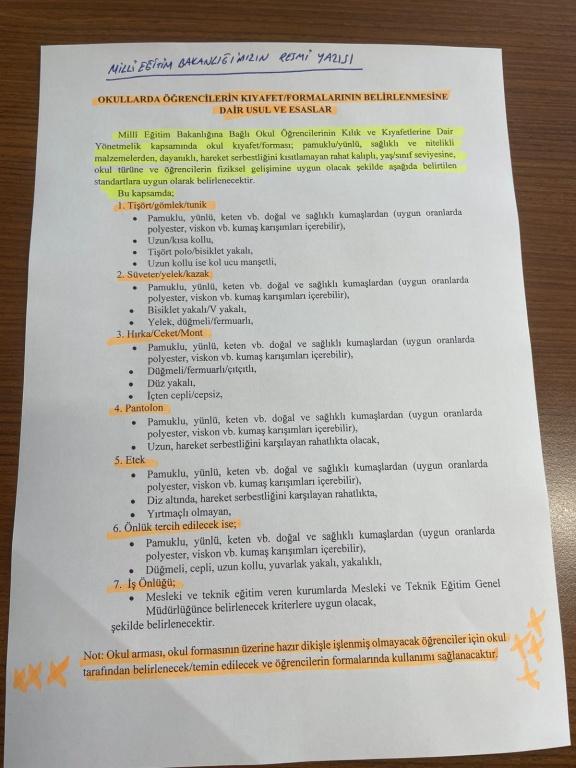 Yeni okul kıyafetimiz Milli Eğitim Bakanlığımızın Resmi yazısı gereğince 2. Dönem Öğretmenler Kurulu Toplantısında görüşülmüş olup konuyla ilgili Komisyon kurulmuştur. Okul Kıyafetini Belirleme Komisyonu; 04.03.2025 tarihinde toplanarak Yeni Okul Kıyafetimizi belirleyerek tutanak altına alınmıştır. Yeni kıyafetler 9. Sınıflar için zorunludur diğer öğrencilerimiz için isteğe bağlıdır